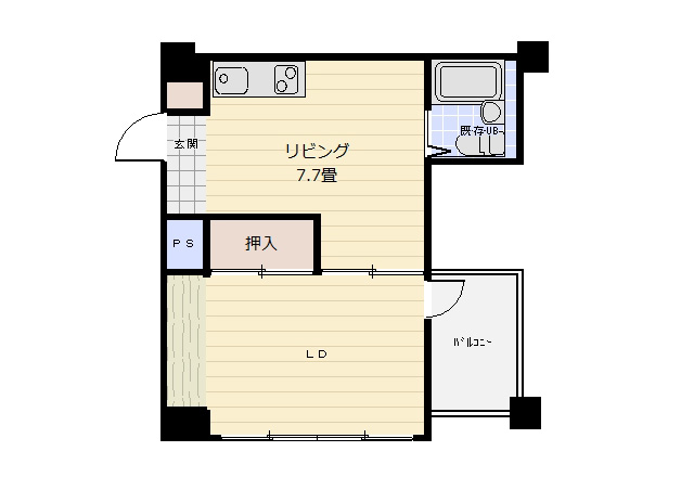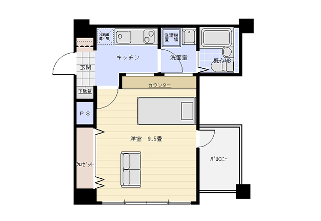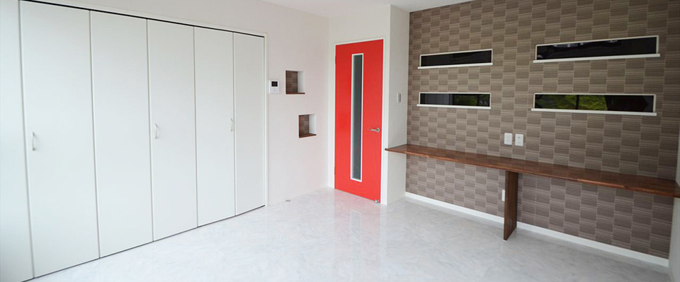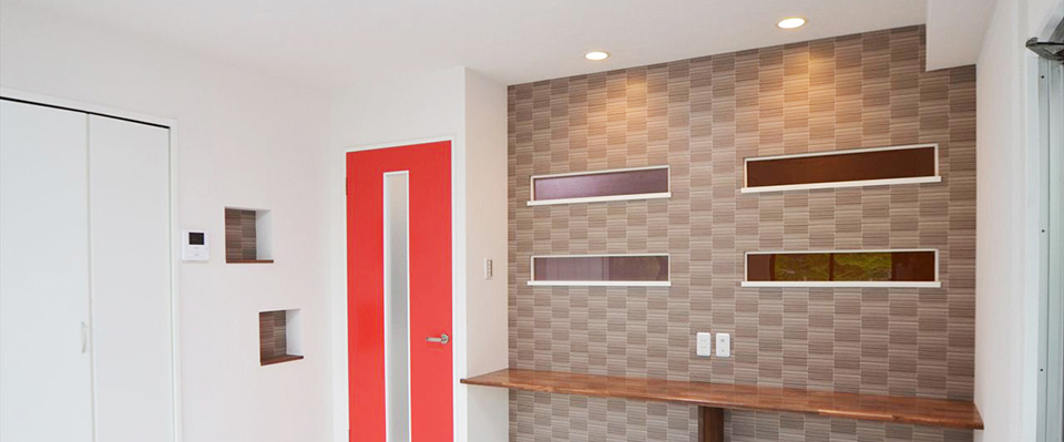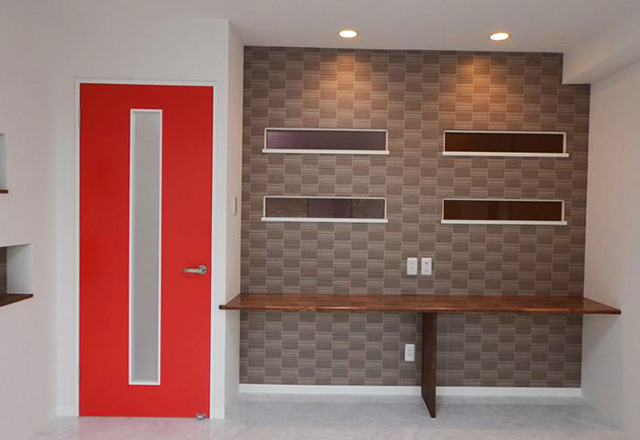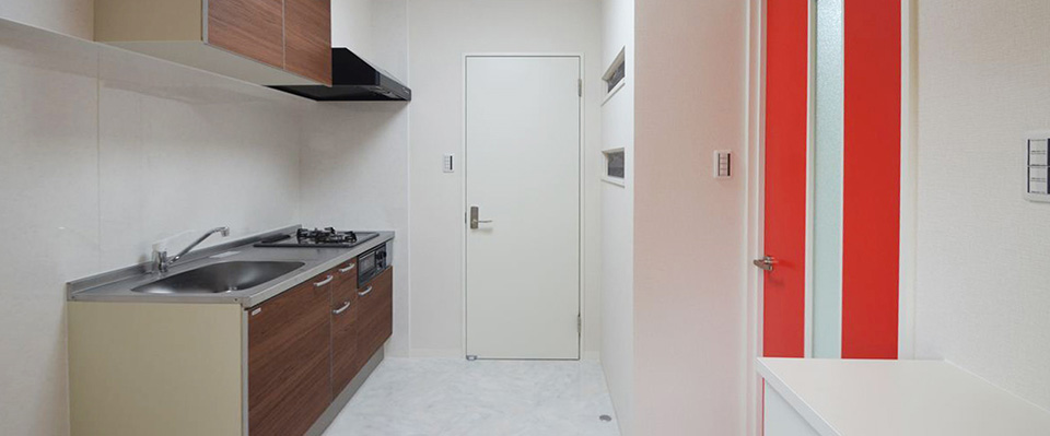 全体を白を基調とし、大理石調フロアタイル、アクセントクロス、ビビットカラーの建具を採用しデザイン性、個性をだして若い単身者をターゲットにリフォームしました。多目的なカウンターを造作し、様々な用途に対応できるようにしました。また、カウンター上にはアクリル板の明かり窓を設置し、キッチン・洗面に光を取り込むとともに居室にデザイン性を持たせました。